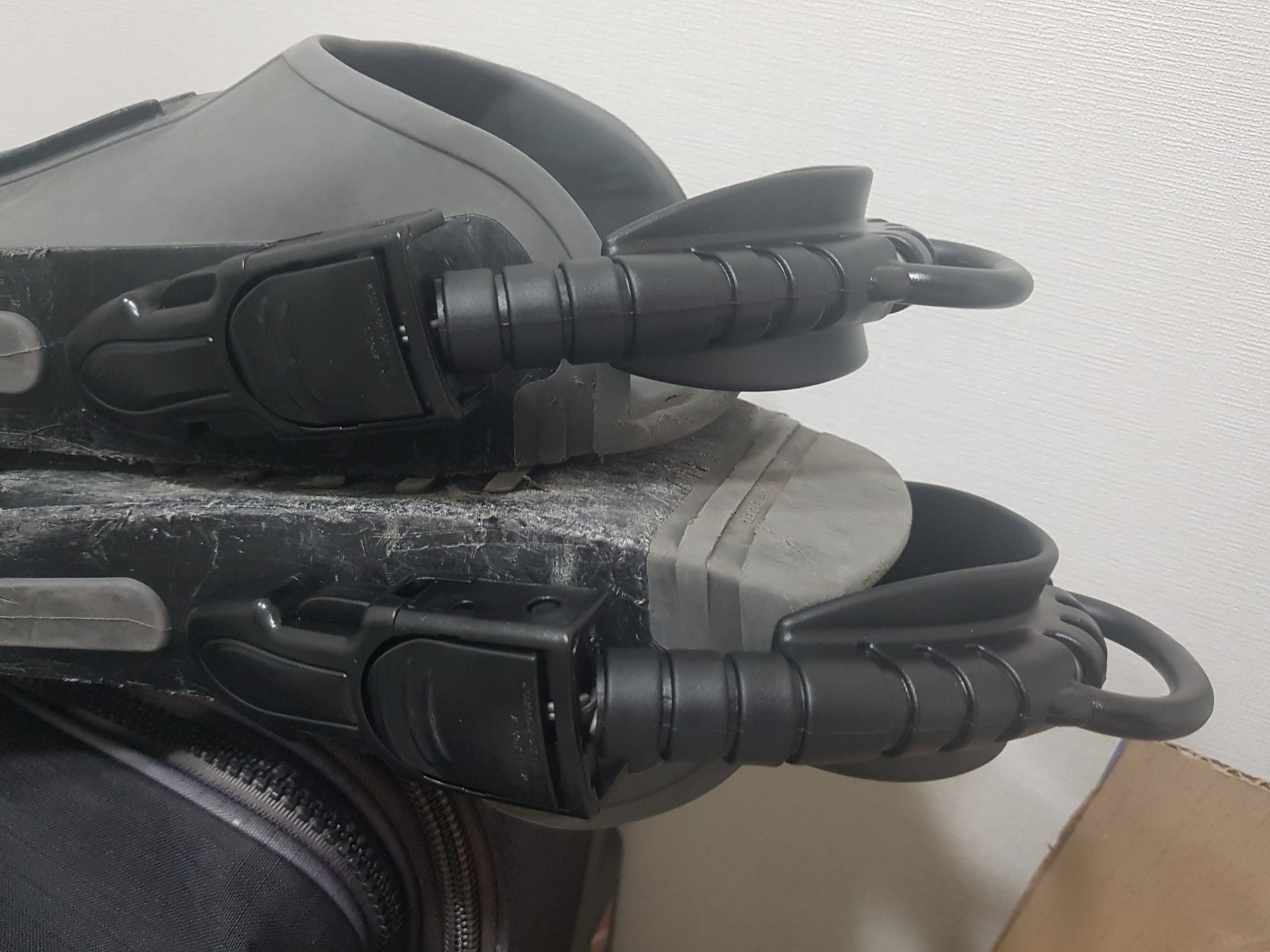 라지 사이즈로 주문했고 제 실측 발사이즈가 265mm 인데, 2mm부츠를 신고 기존 가지고 있던 투산핀에 사용했더니 조금 헐거운 느낌이 있습니다.