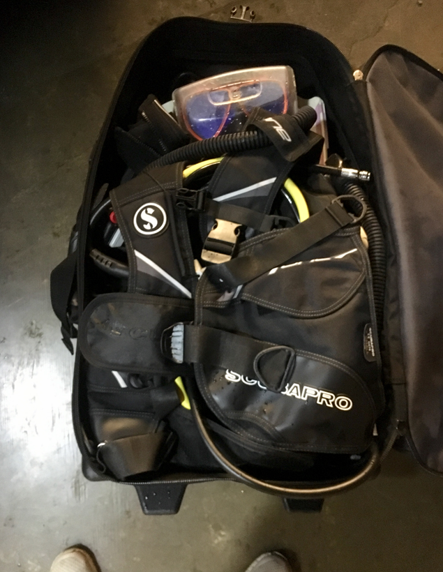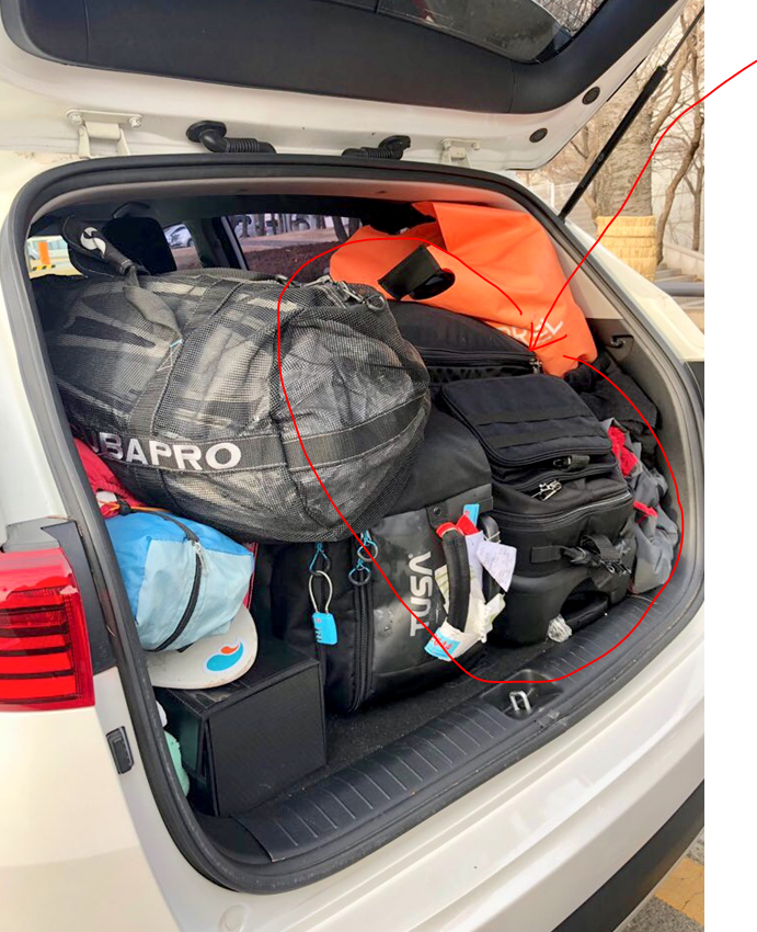 3미리 웻수트 1개5미리 웻수트 1개스쿠바프로 비씨 2개호흡기 2개핀 2개부츠 2개마스크 2개후드 2개손전등 1개+ 고프로, 기타 잡다구리 넣었습니다.