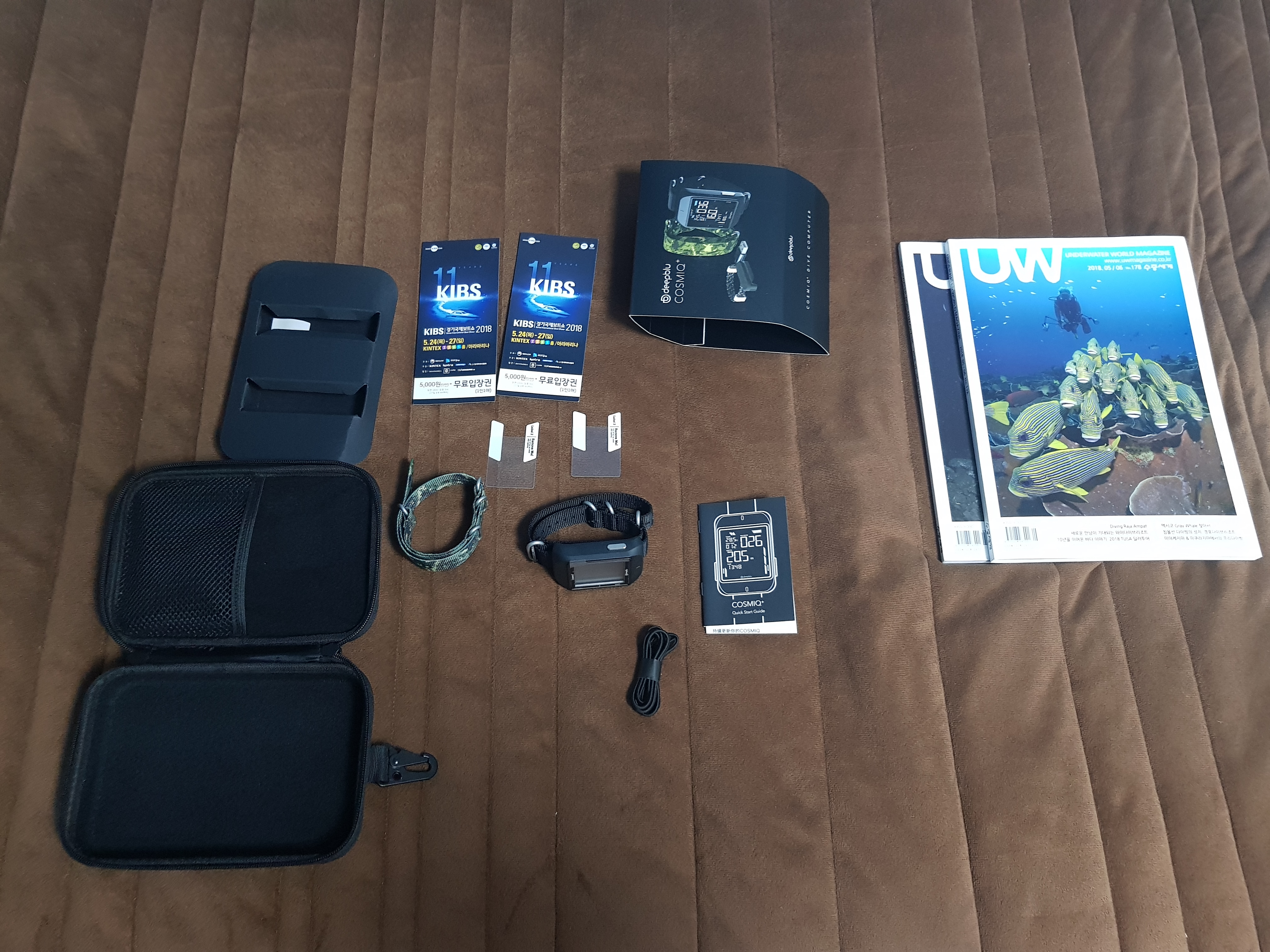 주문한 상품 개봉하니. 사은품으로 주신 언더워터 잡지 2권, 경기국제보트쇼(다이빙쇼)입장권 2개와 본체 케이스가 들어있습니다.