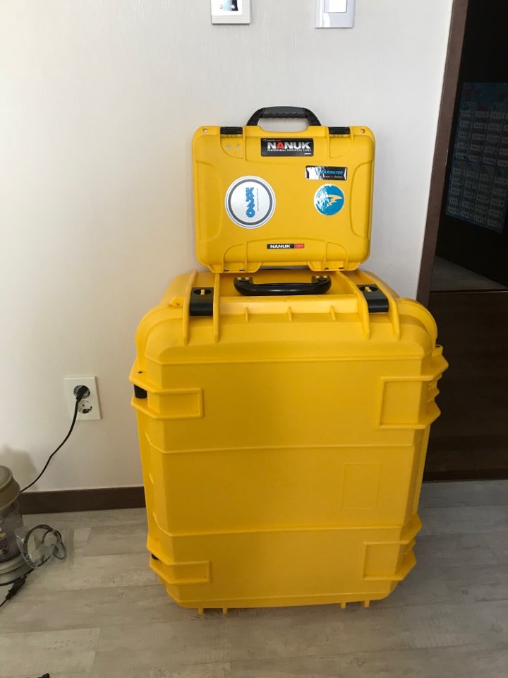 노랭이 세트로 작은거는 중요한 컴퓨터,사진기,라이트 넣고 큰가방은 장비2세트 들어감 대박 수납공간!~~~~~~ BCD2개 호흡기2개 핀2개 수경2개 SMB2개 기타 공구들 다들어감 대박사이즈 입니다. 국내다이빙 전용이기는 하지만,