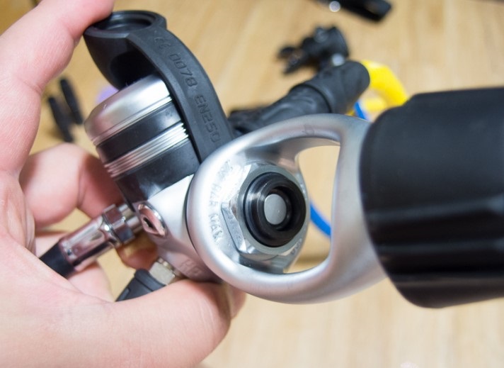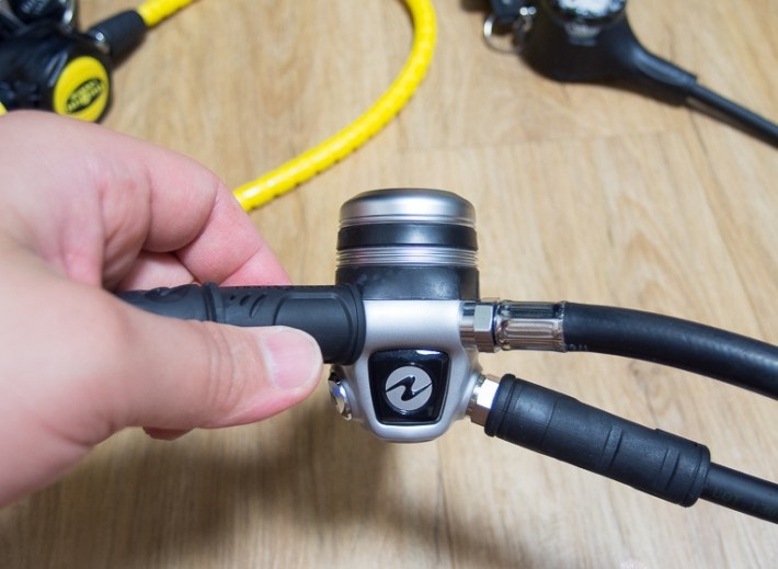 아쿠아렁의 ACD(Auto closure device)시스템은 탱크가 체결되지 않았을 때 먼지마개를 닫지 않아도 물을 차단하는 훌륭한 기능입니다.